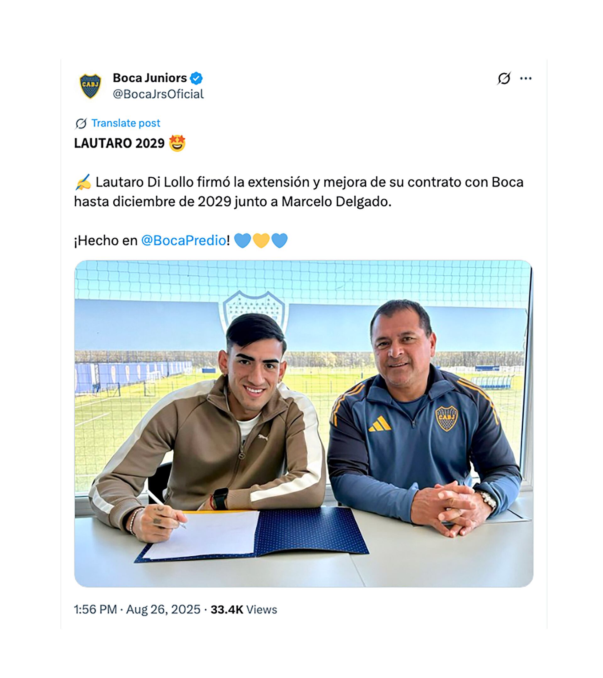 Así lo anunció el club de la Ribera a través de sus redes sociales: “Lautaro Di Lollo firmó la extensión y mejora de su contrato con Boca hasta diciembre de 2029 junto a Marcelo Delgado”. El único de los integrantes del desmembrado Consejo de Fútbol, el Chelo Delgado, compareció a la firma de su renovación en el Boca Predio.