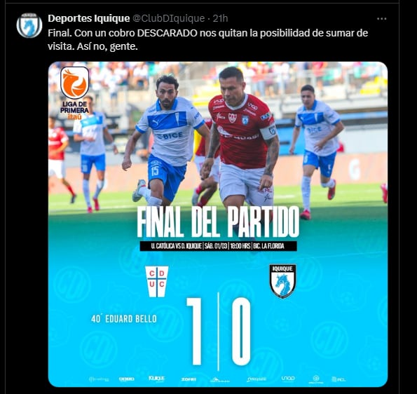 A través de sus redes sociales, Deportes Iquique se quejó de lo ocurrido ante Universidad Católica. “Increíble el gol válido que nos anulan”, escribió cuando conocieron la postura de los jueces tras el tanto de Steffan Pino. “Así no podemos, gente. Contra eso, no”, agregaron minutos después.