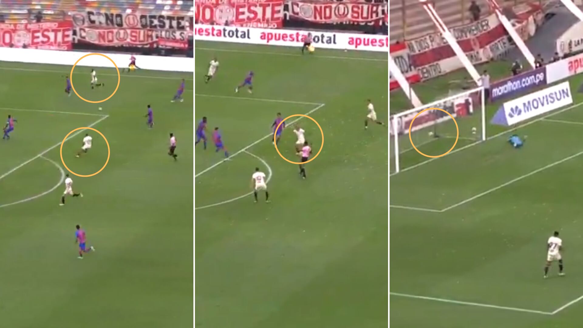 Esta acción se llevó a cabo a los apenas a los dos minutos de haber iniciado el partido. El conjunto de Huánuco perdió la posesión de la pelota luego de un mal control de Félix Espinoza. José Carabalí armó una jugada para la ‘U’ y jugó con Matías Di Benedetto, quien se apoyó en Rodrigo Ureña y este lo hizo con el carrilero ecuatoriano, para luego descargar con Horacio Calcaterra.