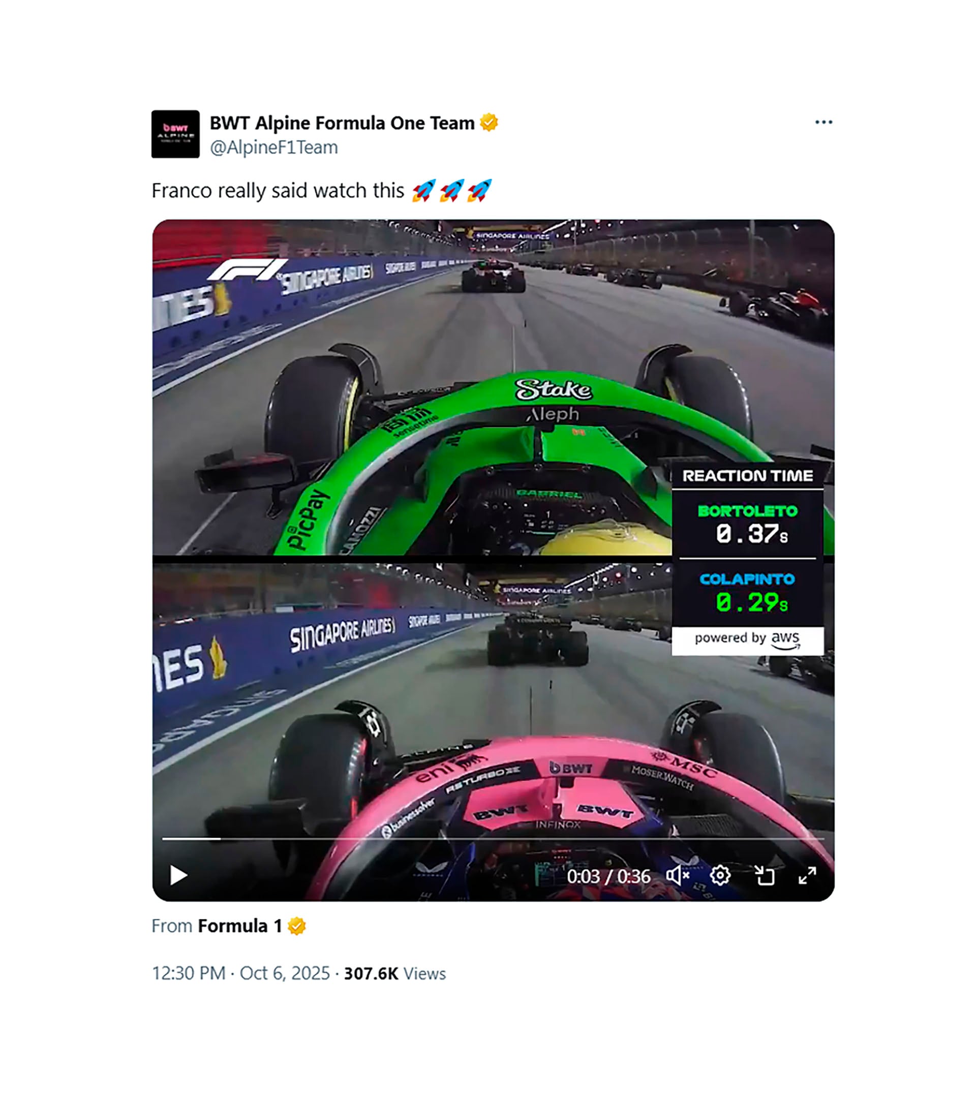 “¡Esas largadas de Franco Colapinto y Gabi Bortoleto en Singapur!“, destacó el perfil de la Máxima en sus redes sobre este ”duelo de sudamericanos» en el inicio del GP de Singapur. La cuenta de Alpine replicó el video y firmó: “Franco realmente dijo: ‘¡Mira esto!’“. En el video mostraron la toma tanto desde la onboard del A525 como del C45 que piloteó el brasileño, lo que permitió también ver cómo Franco llevó su monoplaza en los primeros movimientos para aventajar también al Aston Martin de Lance Stroll y el Red Bull de Yuki Tsunoda.