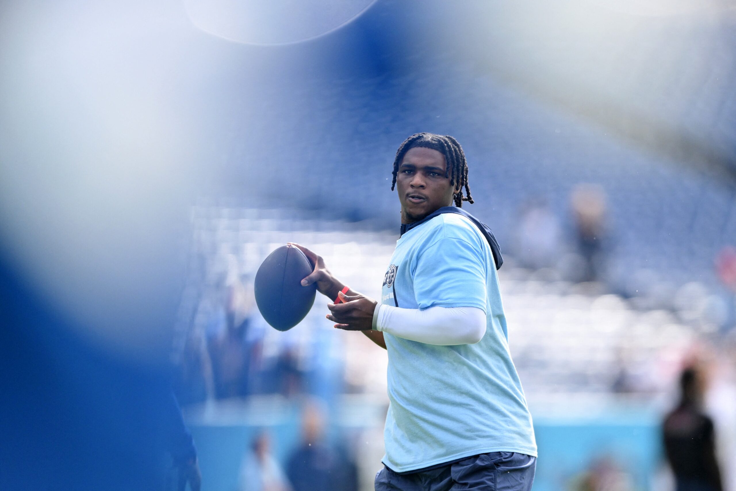 Ward, en el calentamiento previo al duelo ante New England Patriots (Steve Roberts-Imagn Images)