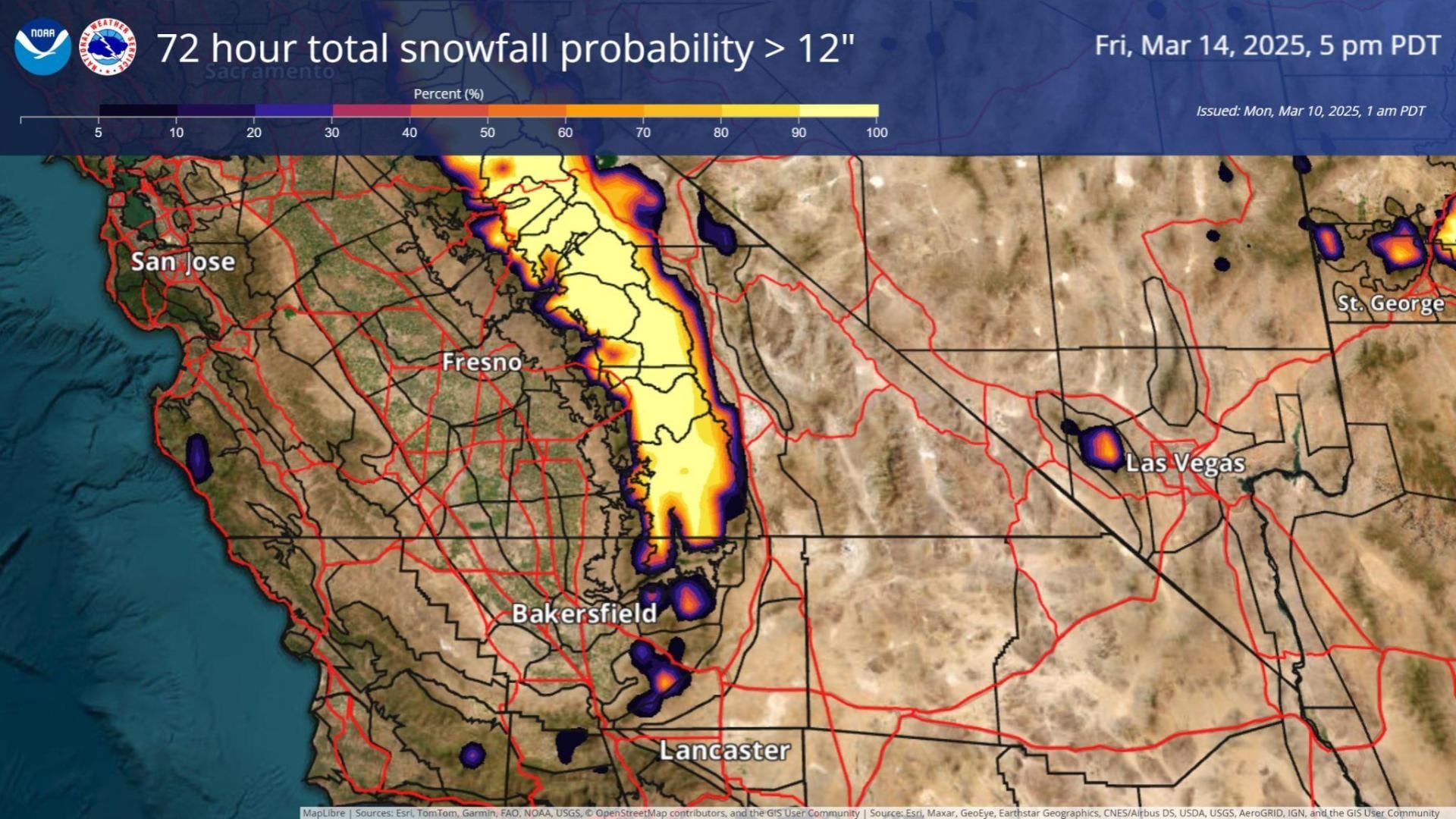 Sierra Nevada será una de las regiones más golpeadas por esta tormenta. Según el NWS, las acumulaciones de nieve podrían alcanzar entre 30 y 90 centímetros en elevaciones superiores a los 1200 metros, con picos de hasta 1,2 metros en las zonas más altas. Las ráfagas de viento, que podrían llegar a los 90 km/h, dificultarán aún más las condiciones, al reducir la visibilidad y aumentar el riesgo de caída de árboles y ramas.