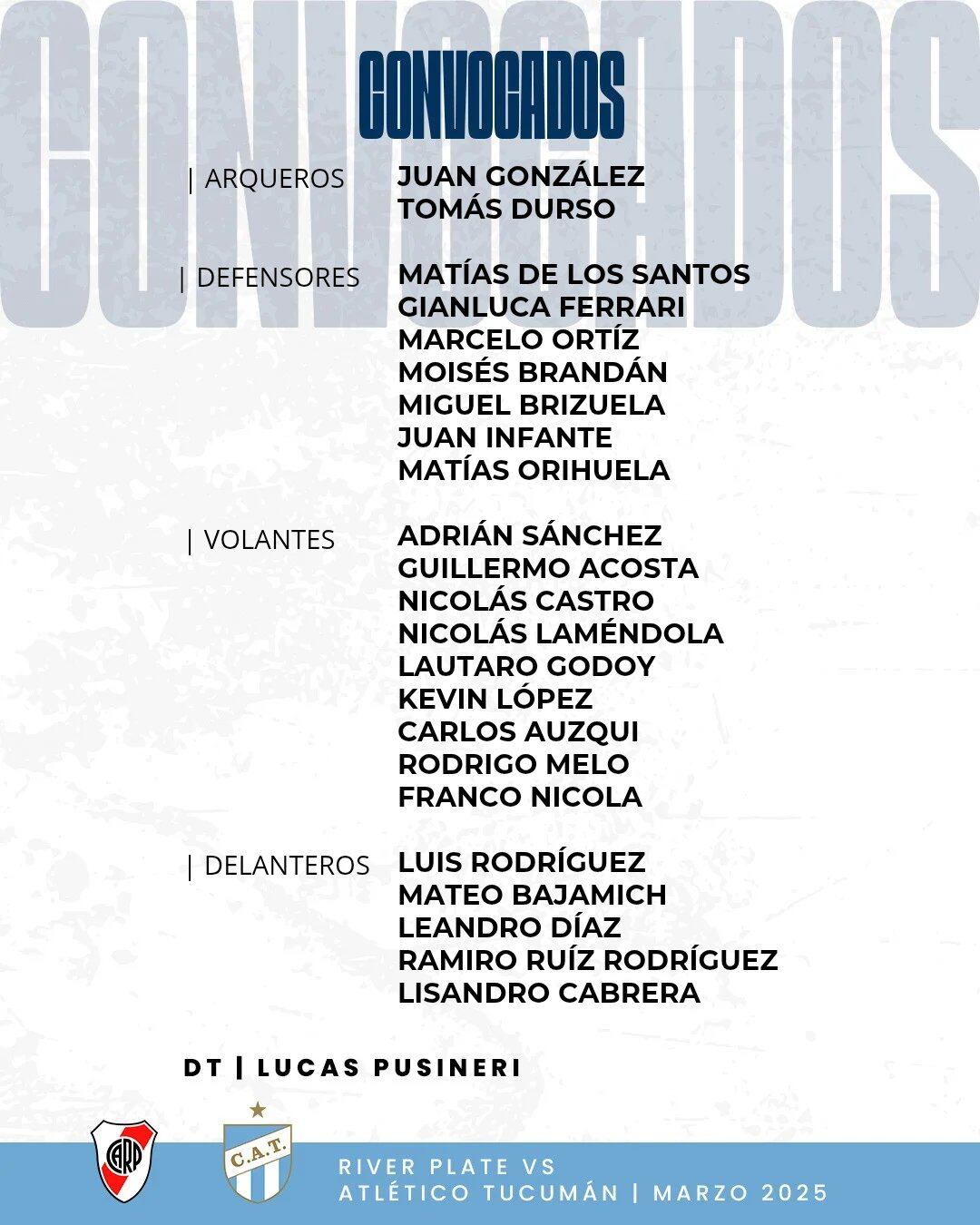 Atlético Tucumán: Tomás Durso; Damián Alberto Martínez, Matías de los Santos, Miguel Brizuela, Matías Orihuela; Ramiro Ruiz Rodríguez, Guillermo Acosta, Adrián Sánchez, Nicolás Laméndola; Leandro Díaz y Luis Rodríguez. DT: Lucas Pusineri