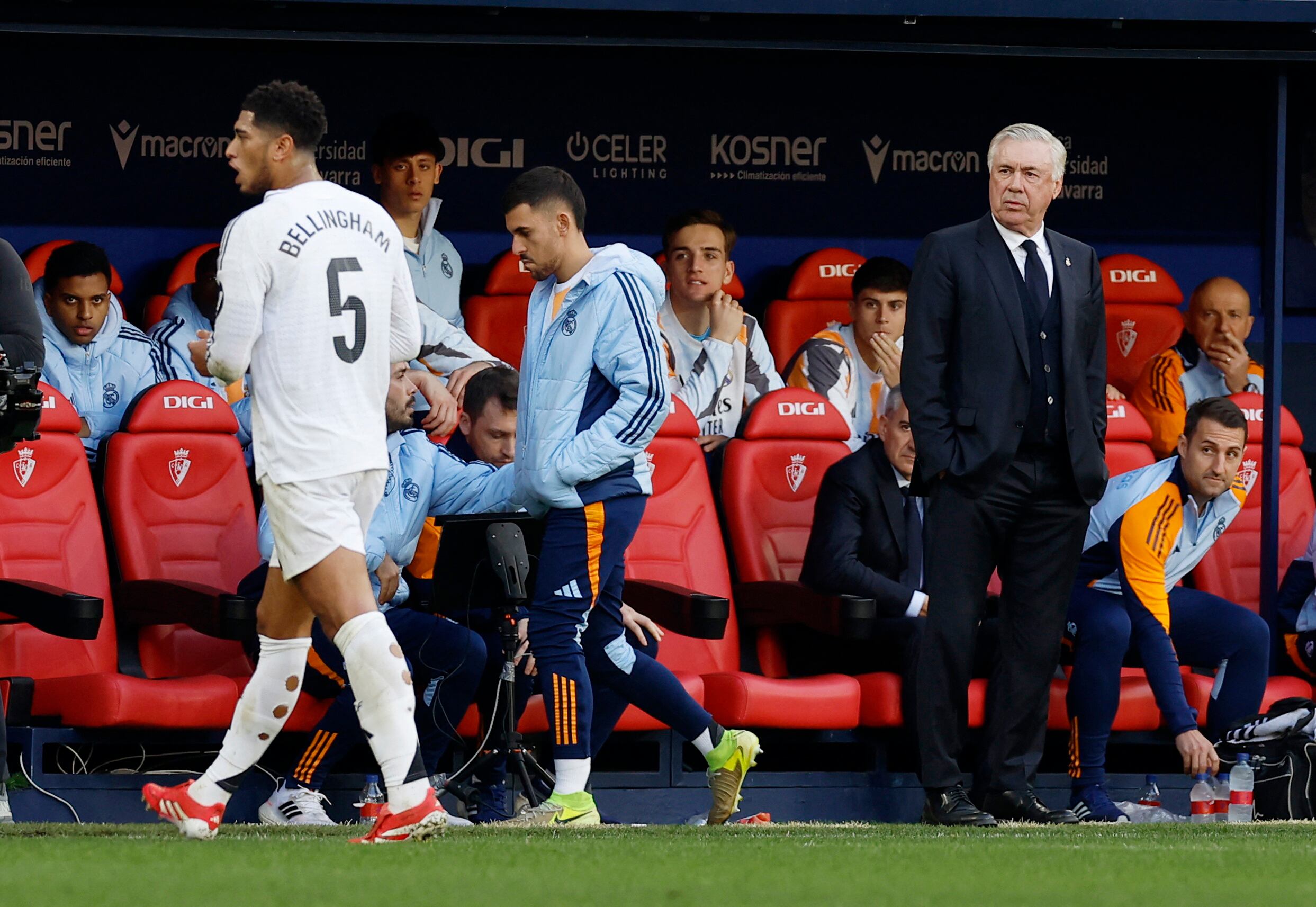 Ancelotti observa a Bellingham salir del césped expulsado. (Vincent West/Reuters)