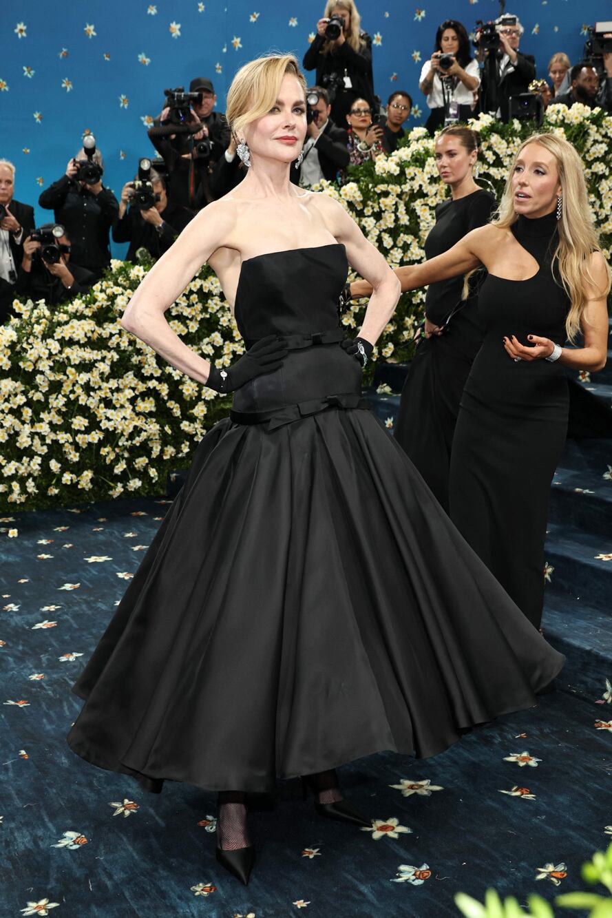 Kidman, que el próximo 21 de mayo estrenará la segunda temporada de Nine Perfect Strangers, completó su estilismo con un vestido strapless con detalles de moños en la cintura y en la cadera, falda voluminosa y guantes cortos adornados con joyas de Cindy Chao. El mismo fue una recreación moderna de un diseño de Cristóbal Balenciaga de los años 50.
