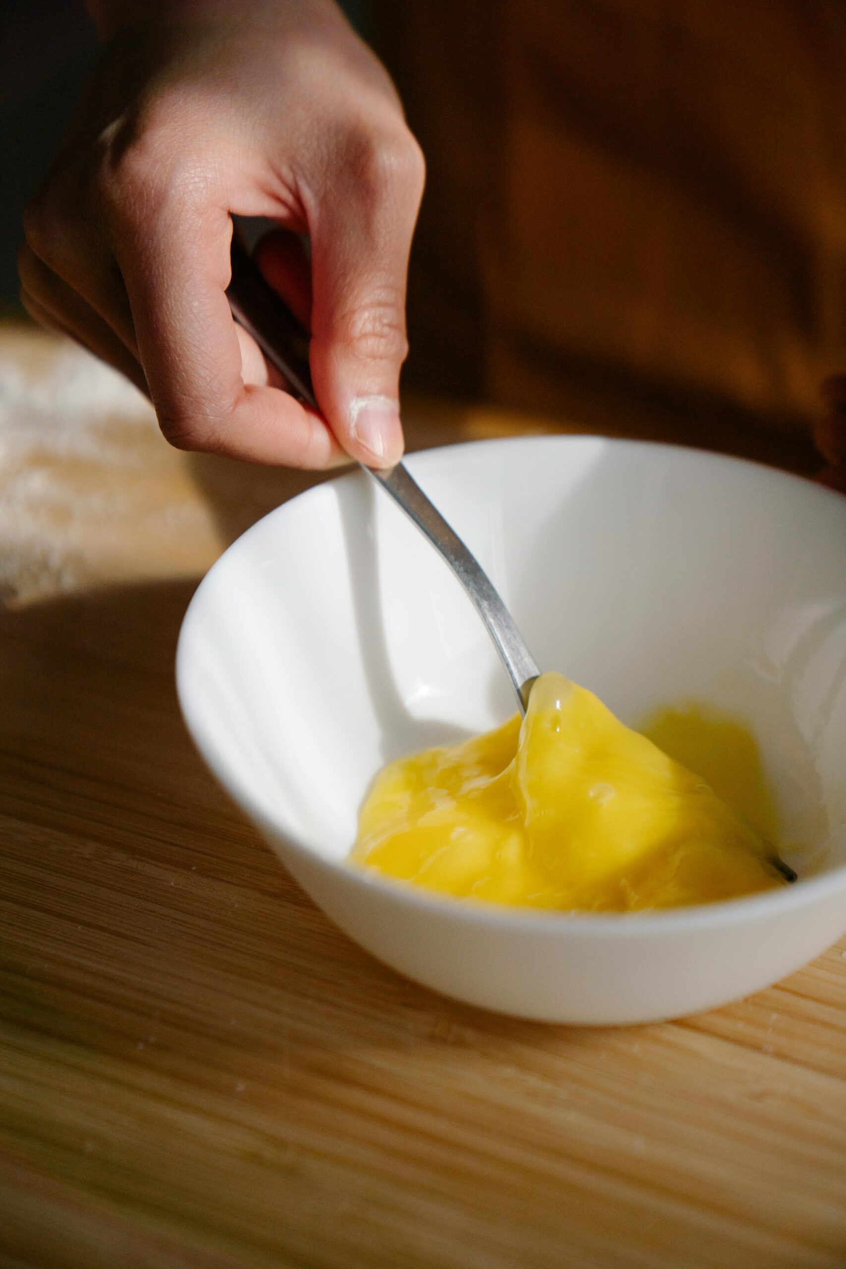 1. Aplastar las yemas de huevo hasta formar una pasta.