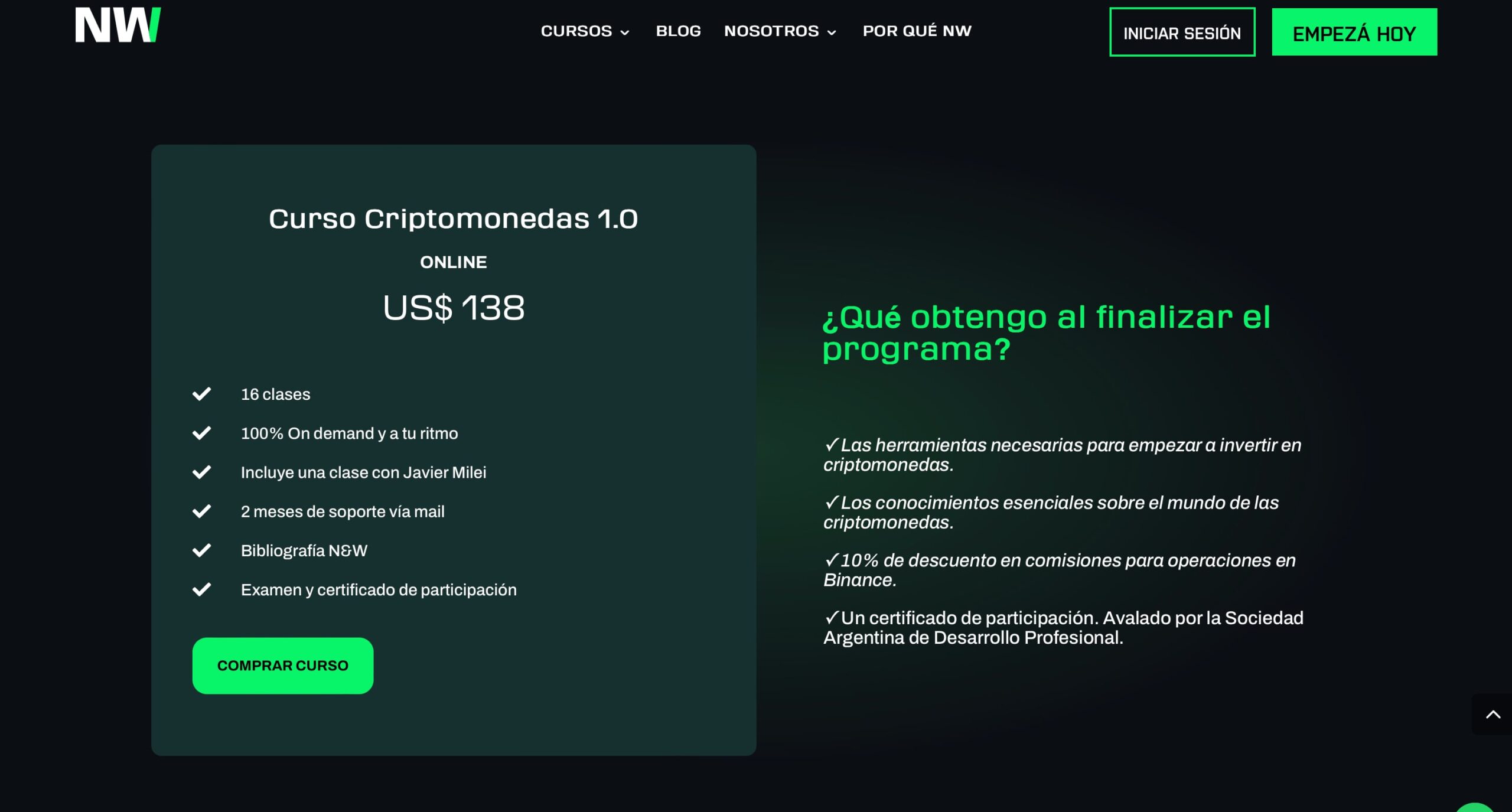 La página web de NW Professionals, la escuela de traders del argentino Mauricio Novelli, publicitaba para su curso de Criptomonedas 1.0 una charla con el presidente Javier Milei como parte del pack de su programa para aprender a hacer trading de tokens. “16 clases, 100% on demand y a tu ritmo, incluye una clase con Javier Milei, 2 meses de soporte vía mail, Bibliografía N&W y Examen y certificado de participación”, se lee en la promoción para el curso, que vale US$138. La publicación estaba vigente en la página web hasta el momento de publicación de esta nota.