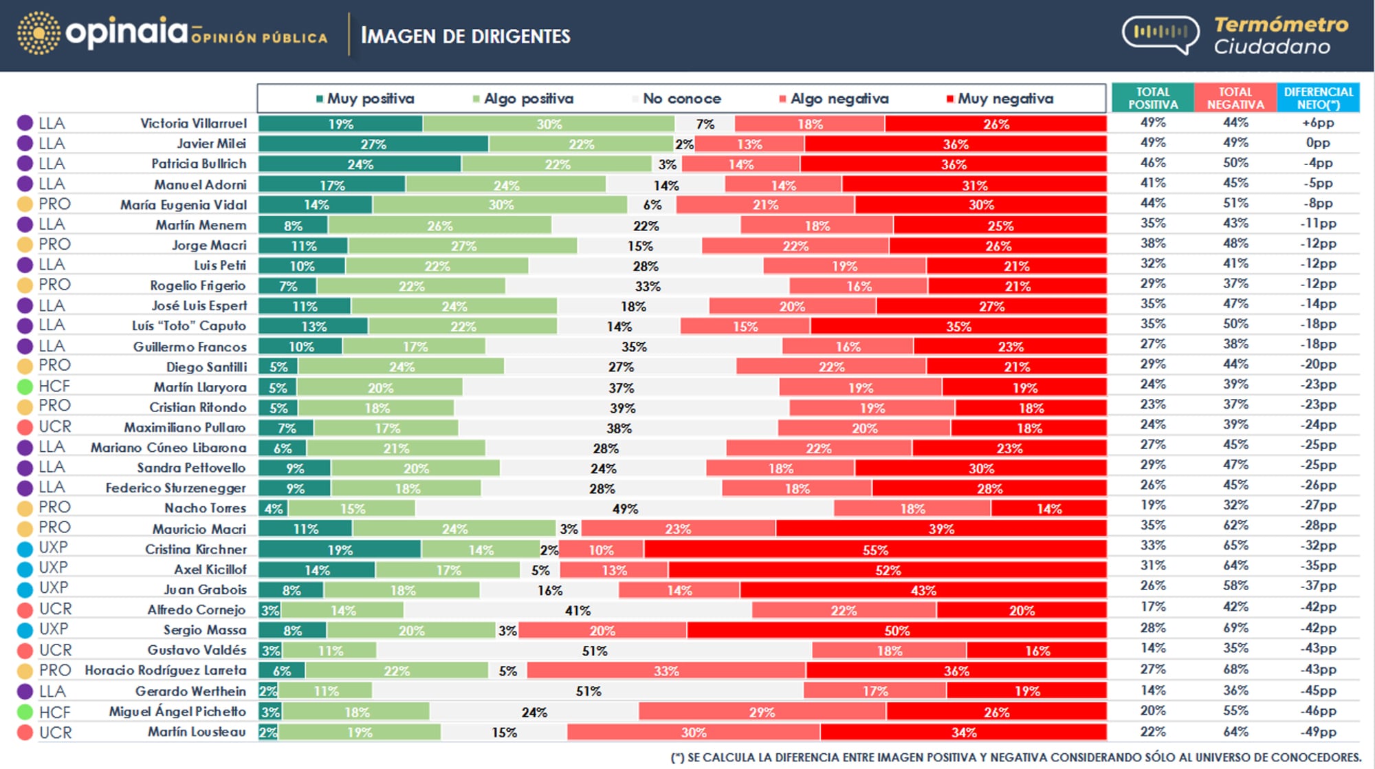 Es así que, en el extremo opuesto de Milei, se ubicó el senador Martín Lousteau. Enfrentado con el gobierno, cuenta con apenas 2% de imagen “muy positiva”, 34% de “muy negativa” y 30% de “negativa”. El balance del radical es apenas superado por Miguel Ángel Pichetto, de Encuentro Federal; y el exprecandidato presidencial Horacio Rodríguez Larreta, con 3 y 6% “muy positivo” y 26% y 36% de “muy negativa”, respectivamente.