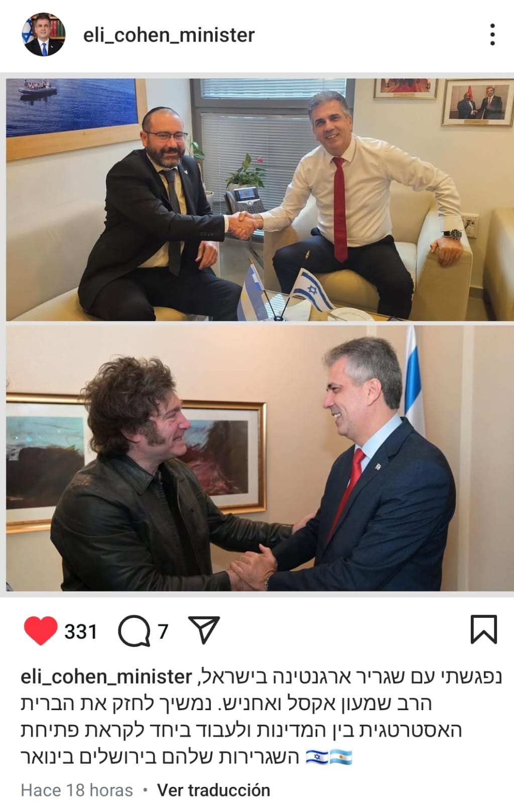 Con tres años como ministro de Economía y uno como canciller, siempre a las órdenes del primer ministro Benjamín Netanyahu, Eli Cohen es hoy una de las voces más potentes del gabinete israelí, en la actualidad como ministro de Energía. Por eso, la foto –y sobre todo el texto– de su reciente encuentro con el embajador argentino, Axel Wahnish, llamó la atención de propios y extraños. “Me encontré con el embajador argentino en Israel, el rabino Simón Axel Wahnish. Continuaremos fortaleciendo el pacto estratégico entre los países, y trabajando juntos de cara a la apertura de su embajada en Jerusalén, en enero”, escribió el ministro israelí en su cuenta de la red X.