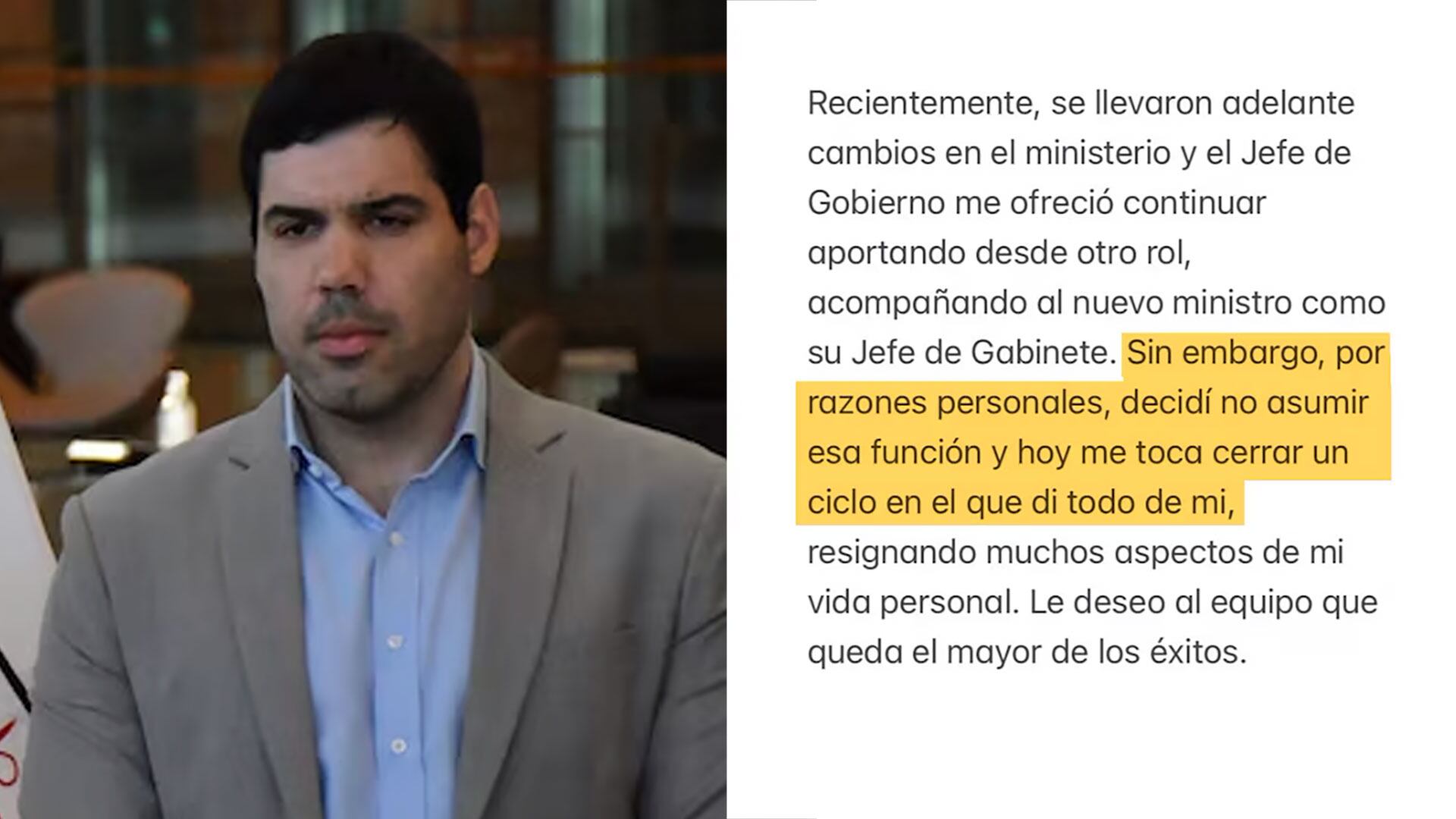 Se trata de Ezequiel Daglio, quien hizo pública su decisión con un posteo en redes sociales donde alegó: “El Jefe de Gobierno me ofreció continuar aportando desde otro rol, acompañando al nuevo ministro como su Jefe de Gabinete. Sin embargo, por razones personales, decidí no asumir esa función“.